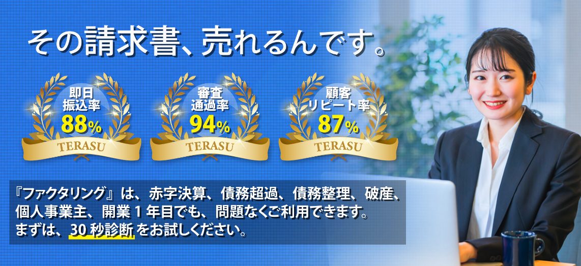 テラスの評判・口コミ:請求書の即日現金化、ファクタリングならテラス(個人事業主、フリーランスにおすすめ)テラスは、Terasu株式会社が運営する20万円からの小口資金から対応、個人事業主、フリーランスにおすすめのファンディング会社です。資金調達にファンディングの活用なら経済産業省推奨しているのがファクタリング