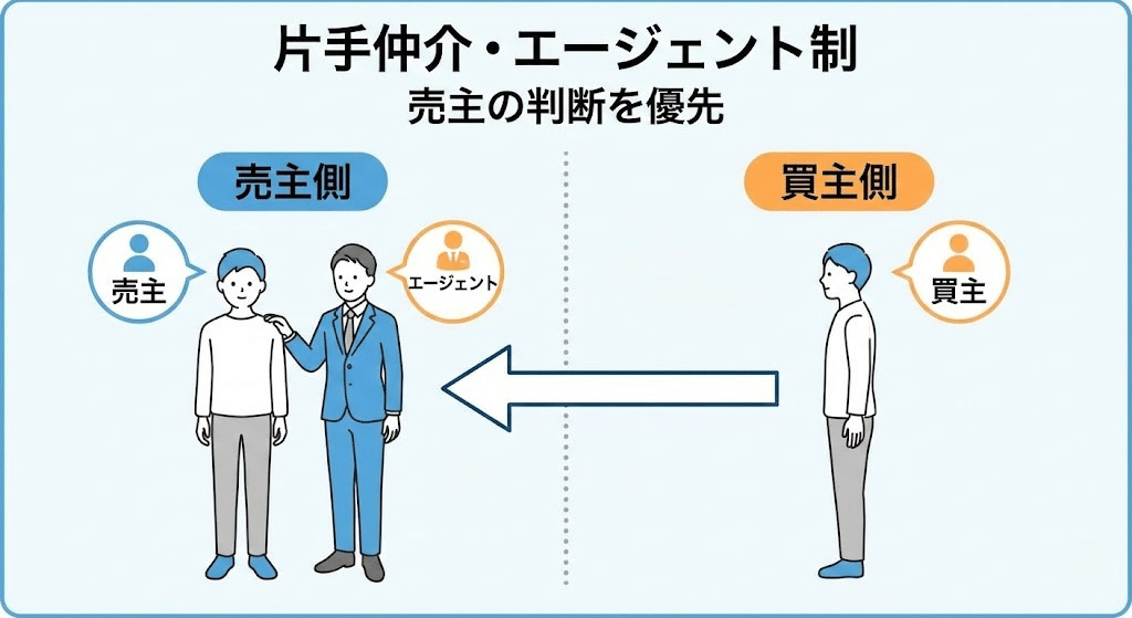 売主側だけを担当するエージェント制(片手取引)です。